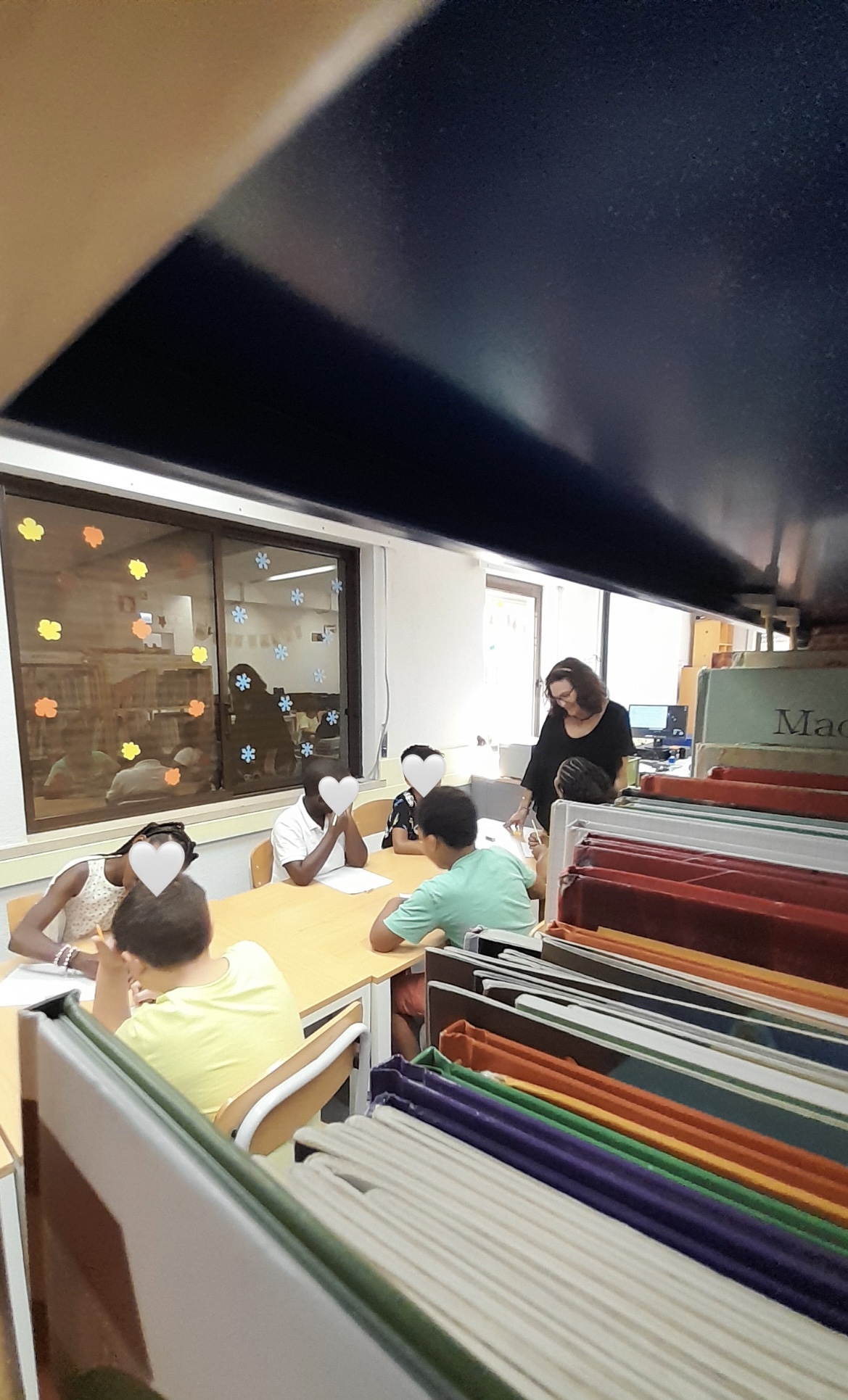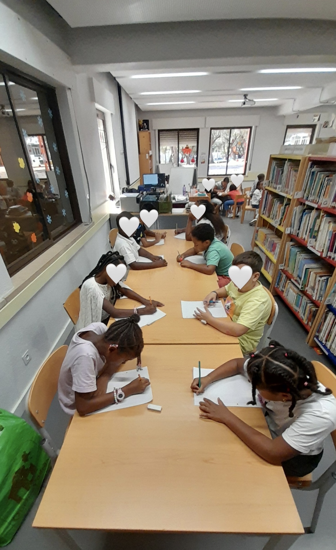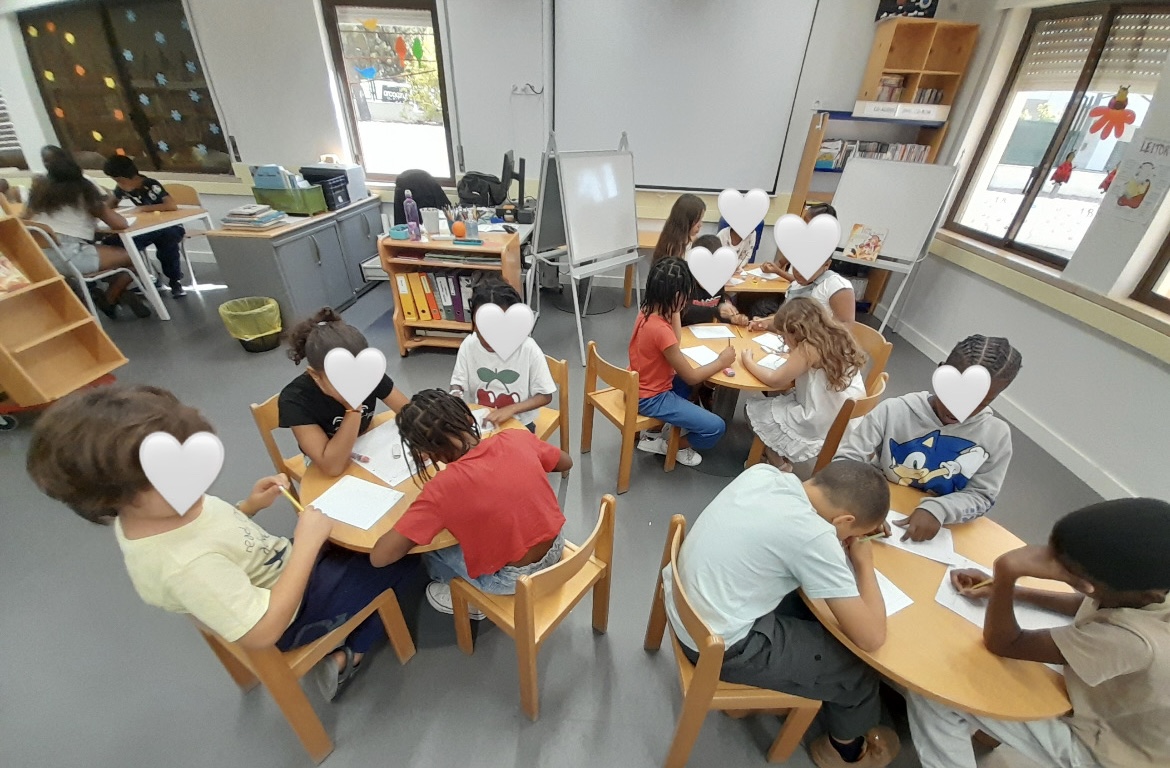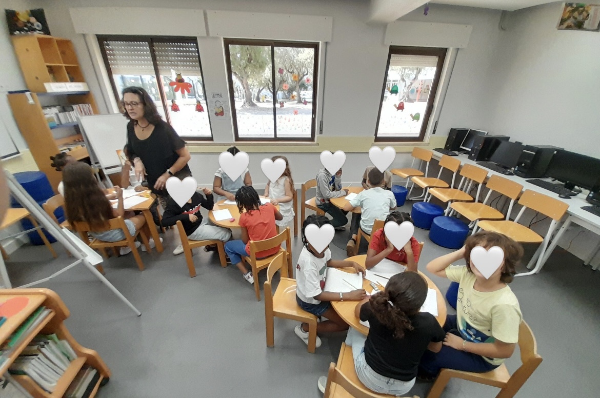 As figuras foram penduradas no painel do piso do 4.º ano e os desenhos ficaram expostos na sala de aula.