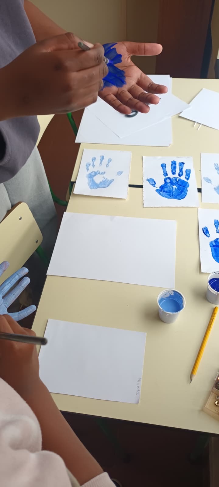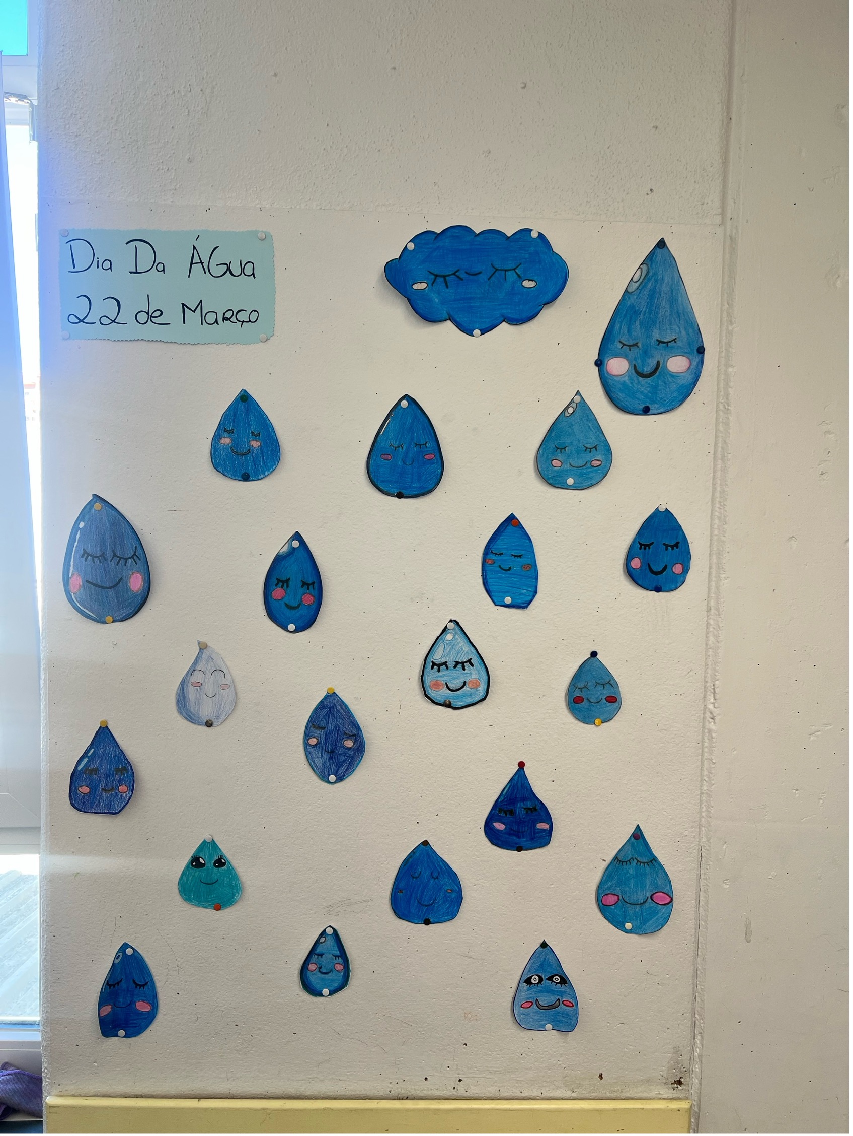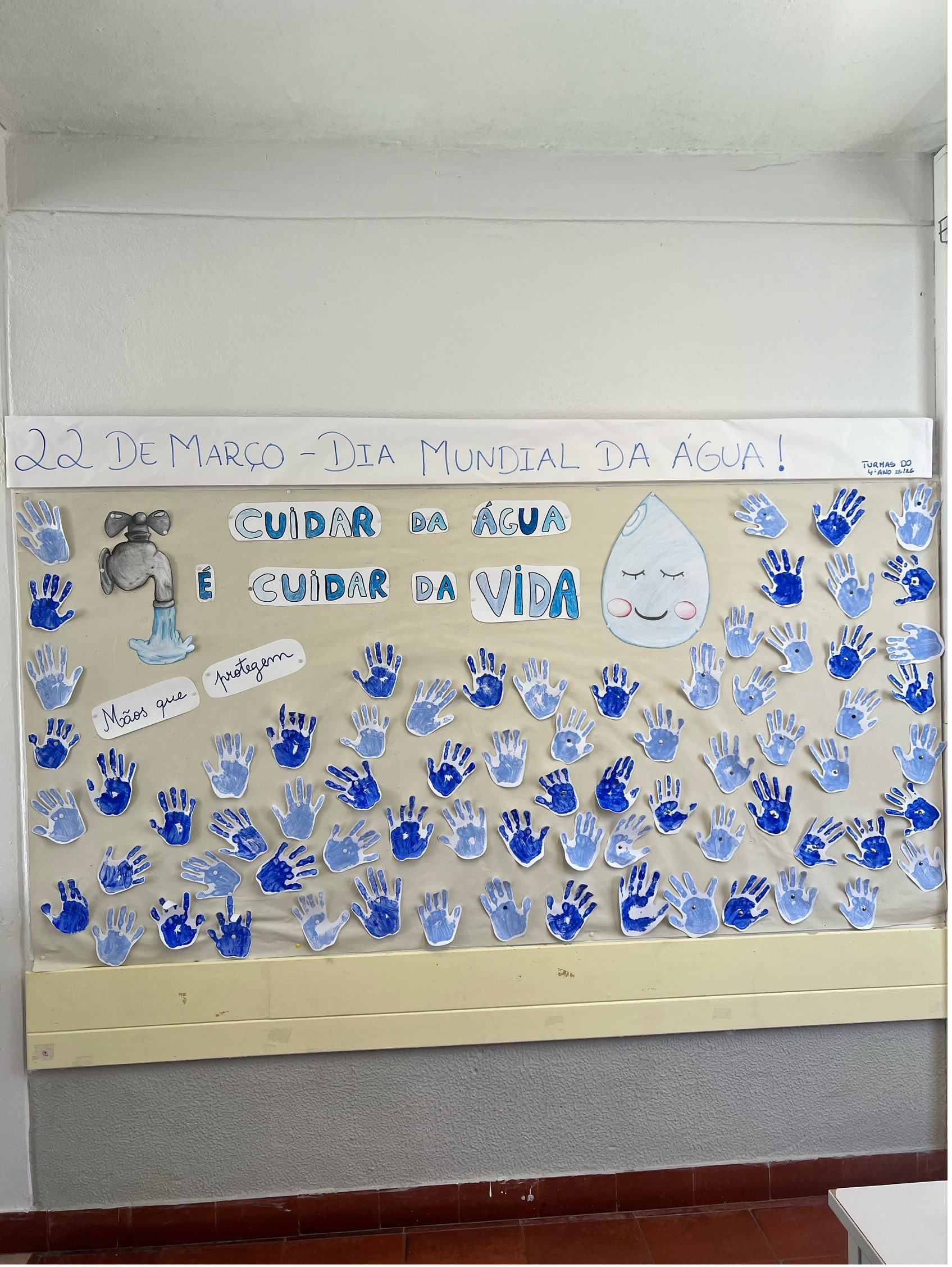Numa primeira fase, foi realizada a decoração do placar à entrada do núcleo, com a participação de todas as turmas. Este espaço foi construído com as mãos das crianças, pintadas em diferentes tons de azul, complementadas com gotas e torneiras desenhadas pelos alunos, onde se destacou a mensagem “Cuidar da água é cuidar da vida” e “Mãos que protegem”.