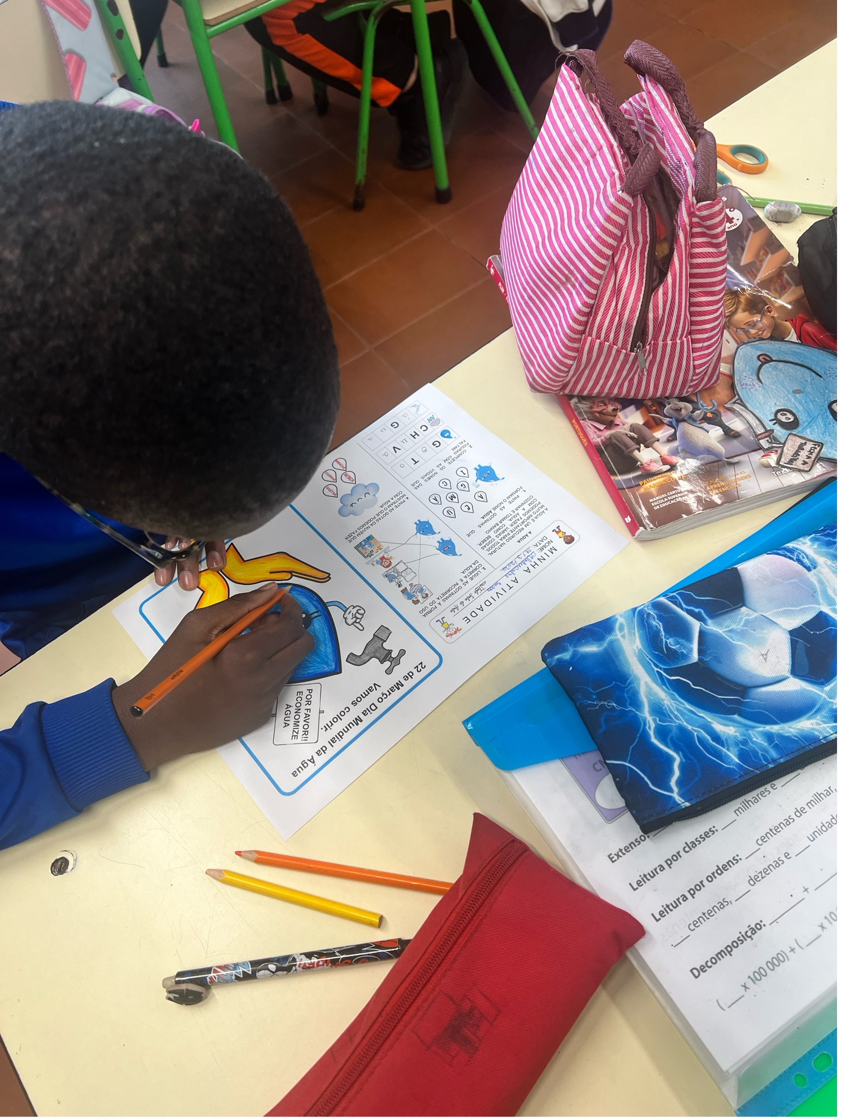 Ao longo desta temática, foram também desenvolvidas atividades nos cadernos, a criação de crachás com a mensagem “Protetor da água” e a realização de trabalhos para exposição nos placares da sala, assinalando esta data importante.