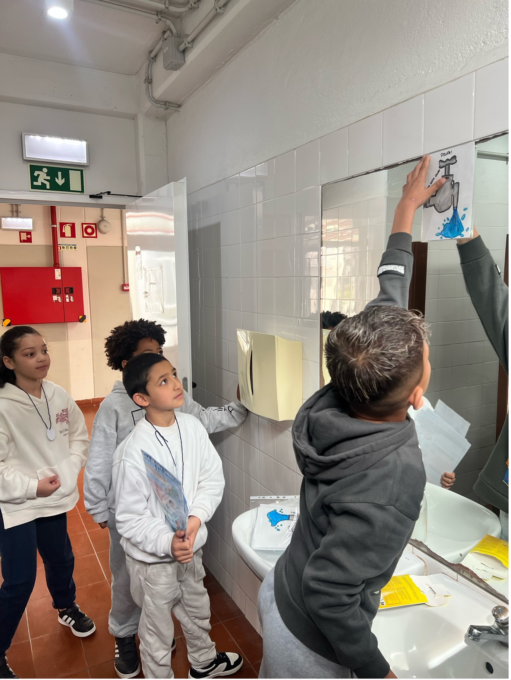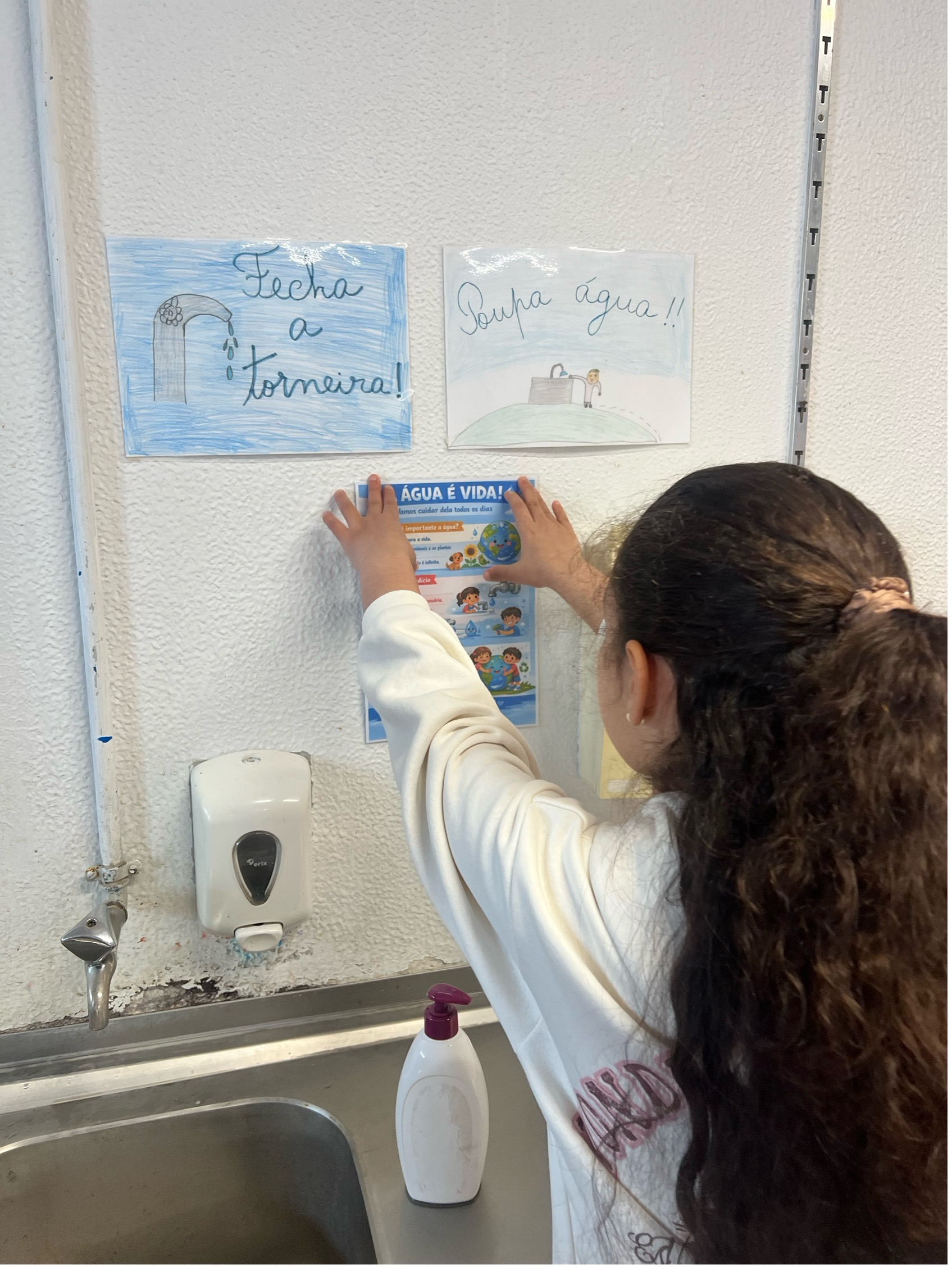 Para reforçar esta sensibilização, foram ainda elaborados cartazes colocados nas casas de banho dos diferentes núcleos, com mensagens como “Cada gota conta! Poupa!” e “Por favor, economize mais água!”, apelando a comportamentos responsáveis no dia a dia. Foi também colocado, no núcleo, um cartaz que destaca a importância da água.